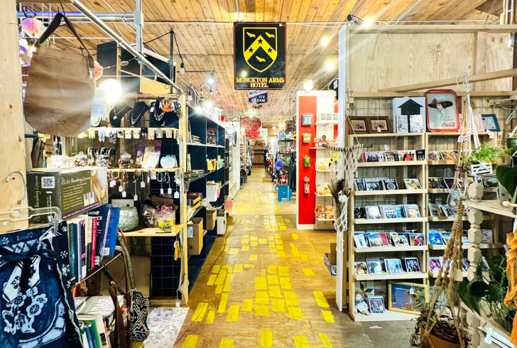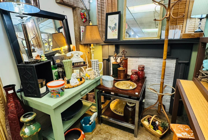 Home décor includes vintage advertising signs, unusual lamps, hand-stitched quilts, and ornate mirrors—offering both sustainable shopping and unique style.